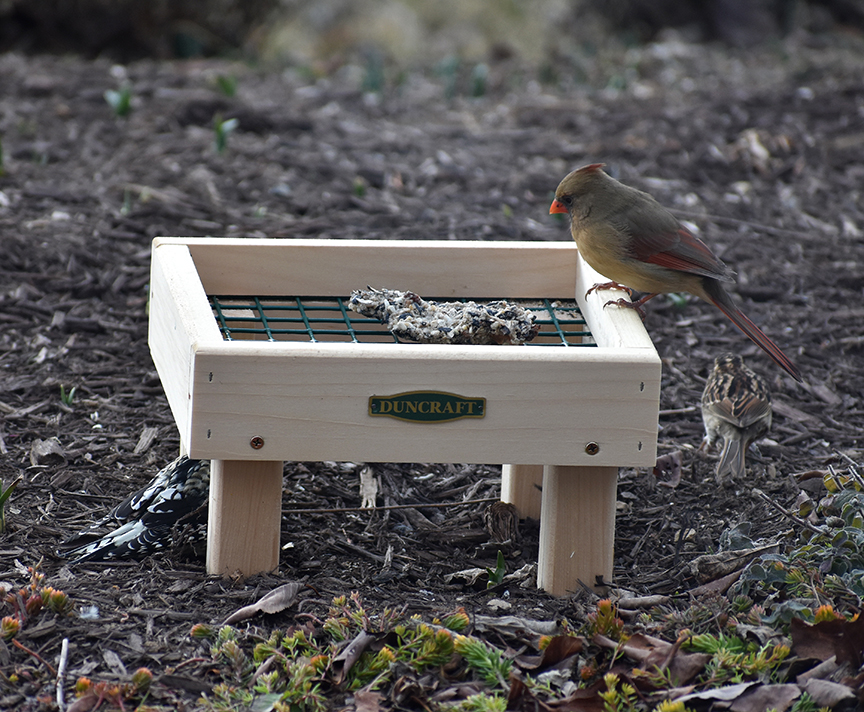 Mrs. Cardinal with woodpecker and sparrow